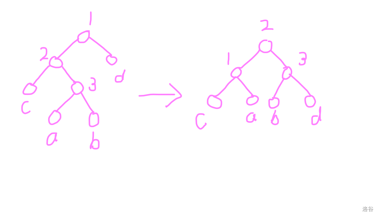 考慮旋轉(zhuǎn)前 \(1, 2, 3\) 中至多出現(xiàn)兩個(gè)失衡點(diǎn),因此 \(d > \frac{18}{16 \times 17} b > \frac{1}{16} b\),\(3\) 節(jié)點(diǎn)不會(huì)失衡。