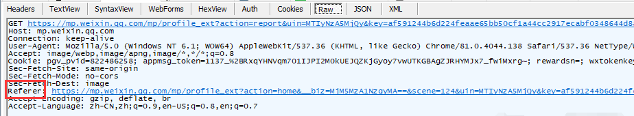 我的方法是使用fiddler抓包抓到pc端微信的公眾號歷史文章的URL,然后再瀏覽器打開,發(fā)現(xiàn)打不開,然后我就發(fā)現(xiàn)請求頭信息里還有一個referer(看下圖),抱著試試看的態(tài)度,發(fā)現(xiàn)可以用本地瀏覽器打開,而且是有數(shù)據(jù)的,那就好辦了啊,直接用selenium哐哐的爬,目前沒有發(fā)現(xiàn)啥限制。