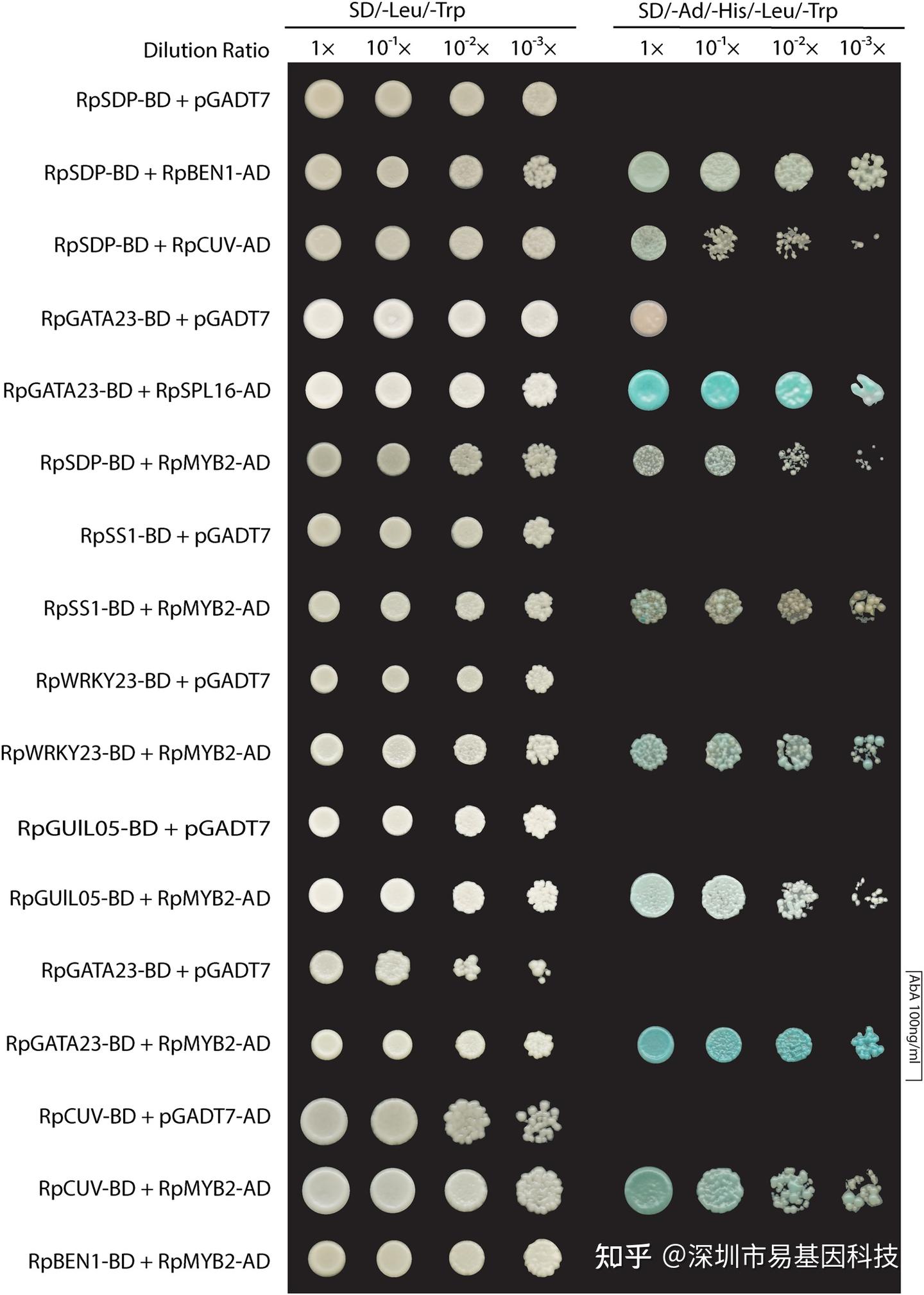 圖4:通過酵母雙雜交實驗檢測蛋白-蛋白互作。展示RpMYB2和RpSDP蛋白與其他蛋白的正向互作。