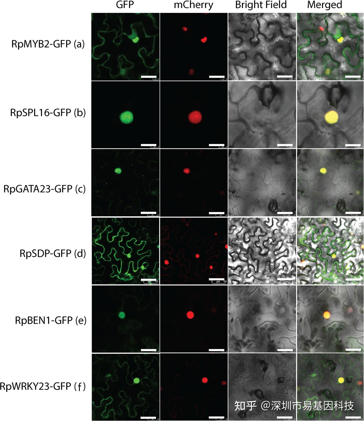 圖6:RpMYB2互作蛋白的亞細胞定位。共聚焦激光掃描顯微鏡圖像顯示了用GFP標記的蛋白的細胞內分布。所有研究的蛋白主要定位于細胞核。RpMYB2、RpSDP和RpWRKY23還顯示出在質膜定位。