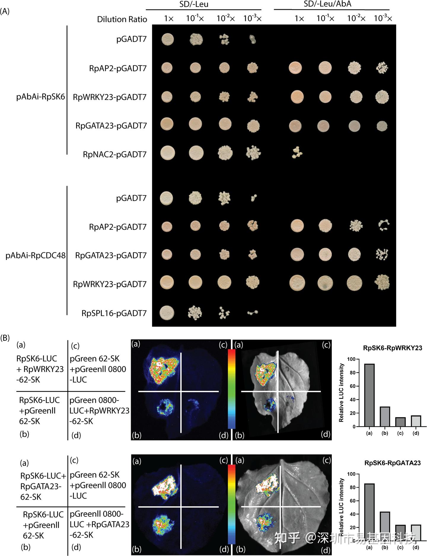 - 熒光素酶報告基因實驗顯示轉錄因子RpWRKY23和RpGATA23與RpSK6啟動子的相互作用。