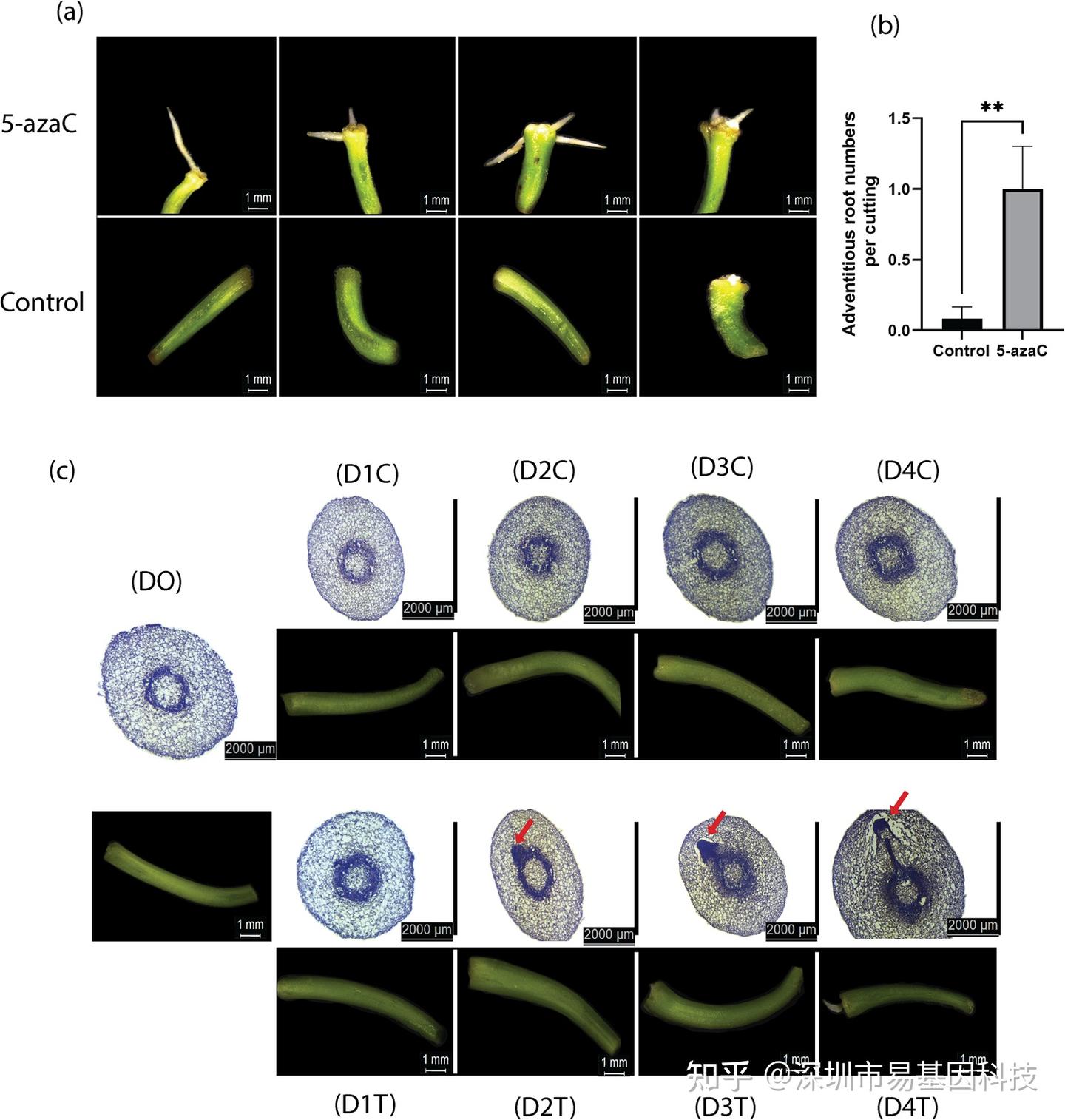 - 植物材料收集與再生:使用刺槐種子萌發后的下胚軸切段作為實驗材料,分別在含和不含5-azaC的培養基上培養,觀察不定根再生情況。