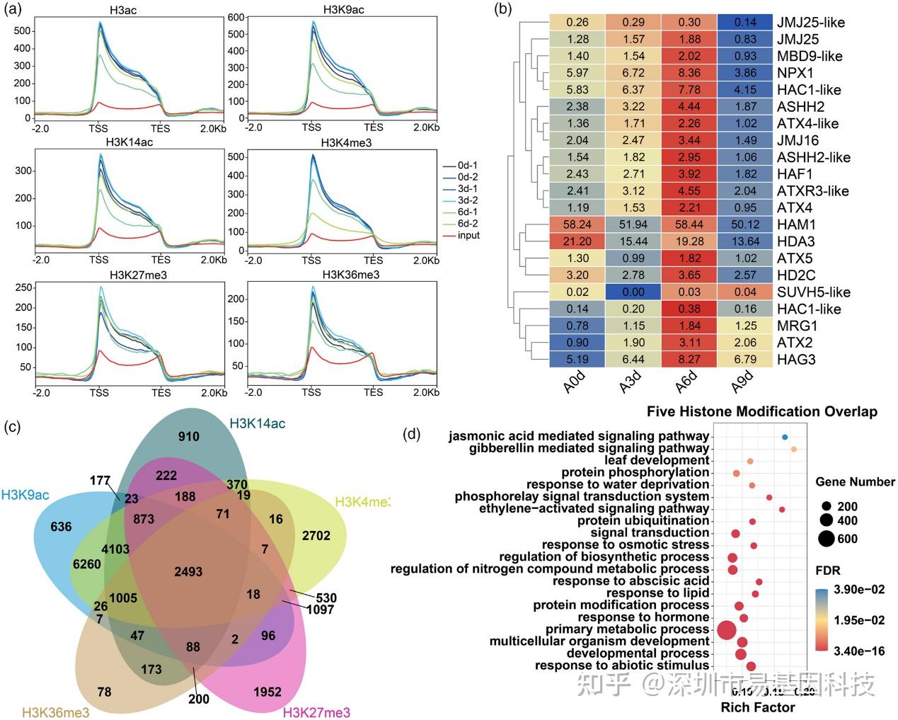 研究通過ChIP-seq技術分析了六種組蛋白修飾(H3ac、H3K9ac、H3K14ac、H3K4me3、H3K27me3和H3K36me3)在干旱處理下的變化。結果顯示,這些組蛋白修飾在基因區域和啟動子區域的分布與基因表達調控密切相關。在干旱處理下,組蛋白修飾的整體水平略有下降,但某些基因區域修飾水平發生顯著變化。如與對照組相比,A6d時H3K4me3、H3K9ac和H3K14ac水平略有下降,而H3K27me3水平則顯著下降。研究還發現組蛋白修飾變化與基因表達變化之間存在一定相關性。如上調基因與H3K27me3低水平相關,而上調基因與H3K4me3高水平相關。這些結果表明,組蛋白修飾在蘋果響應干旱脅迫過程中發揮著重要的調控作用。