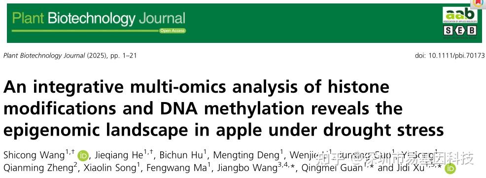 Wang S, He J, Hu B, Deng M, Li W, Guo J, Song Y, Zheng Q, Song X, Ma F, Wang J, Guan Q, Xu J. An integrative multi-omics analysis of histone modifications and DNA methylation reveals the epigenomic landscape in apple under drought stress. Plant Biotechnol J. 2025 Jul 7. doi: 10.1111/pbi.70173.