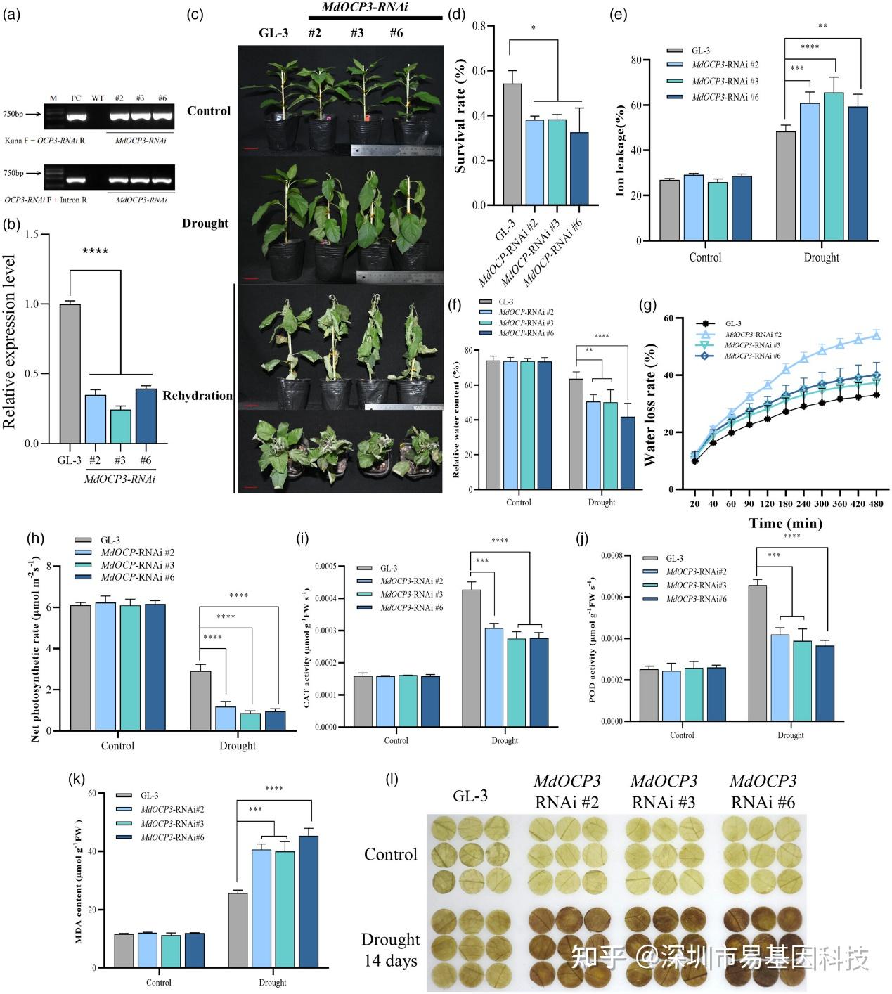 - 圖(c)中GL-3和三條獨立的MdOCP3-RNAi株系存活率。