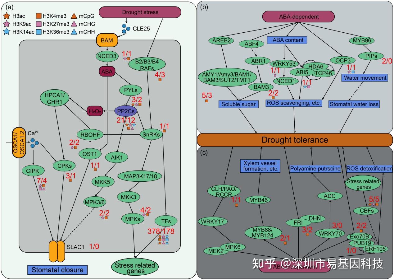 (b-c) 通過表觀遺傳修飾注釋的ABA依賴和ABA非依賴調控網絡。星形代表受組蛋白乙酰化修飾調控的DEGs,正方形代表受組蛋白甲基化修飾調控的DEGs,三角形代表受DNA甲基化修飾調控的DEGs。不同顏色代表不同類型的修飾。