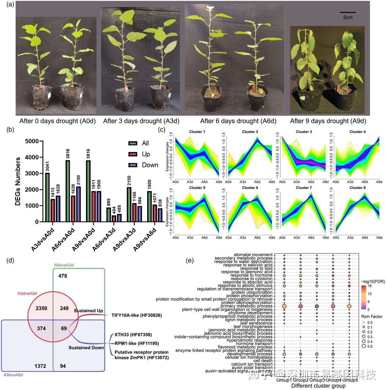 研究通過轉錄組分析發現,在干旱處理3天(A3d)時,蘋果中有3041個差異表達基因(DEGs),表明許多基因在干旱早期就已經響應。隨著干旱時間延長,DEGs數量在6天(A6d)時達到峰值(3818個),9天(A9d)時略有下降(3816個)。基因表達趨勢的聚類分析顯示,大多數基因在A6d時表達量達到峰值,且與水分剝奪相關的基因在A6d時顯著富集。研究還發現一些基因(如TIFY10A-like、XTH33、RPM1-like和PK1)在干旱處理過程中表達量持續上調或下調,這些基因可能在干旱響應中發揮重要作用。通過對不同表達趨勢的基因組分析,結果表明其在缺水、激素響應、離子穩態和代謝過程等通路中顯著富集,表明A6d是蘋果干旱響應的關鍵階段。