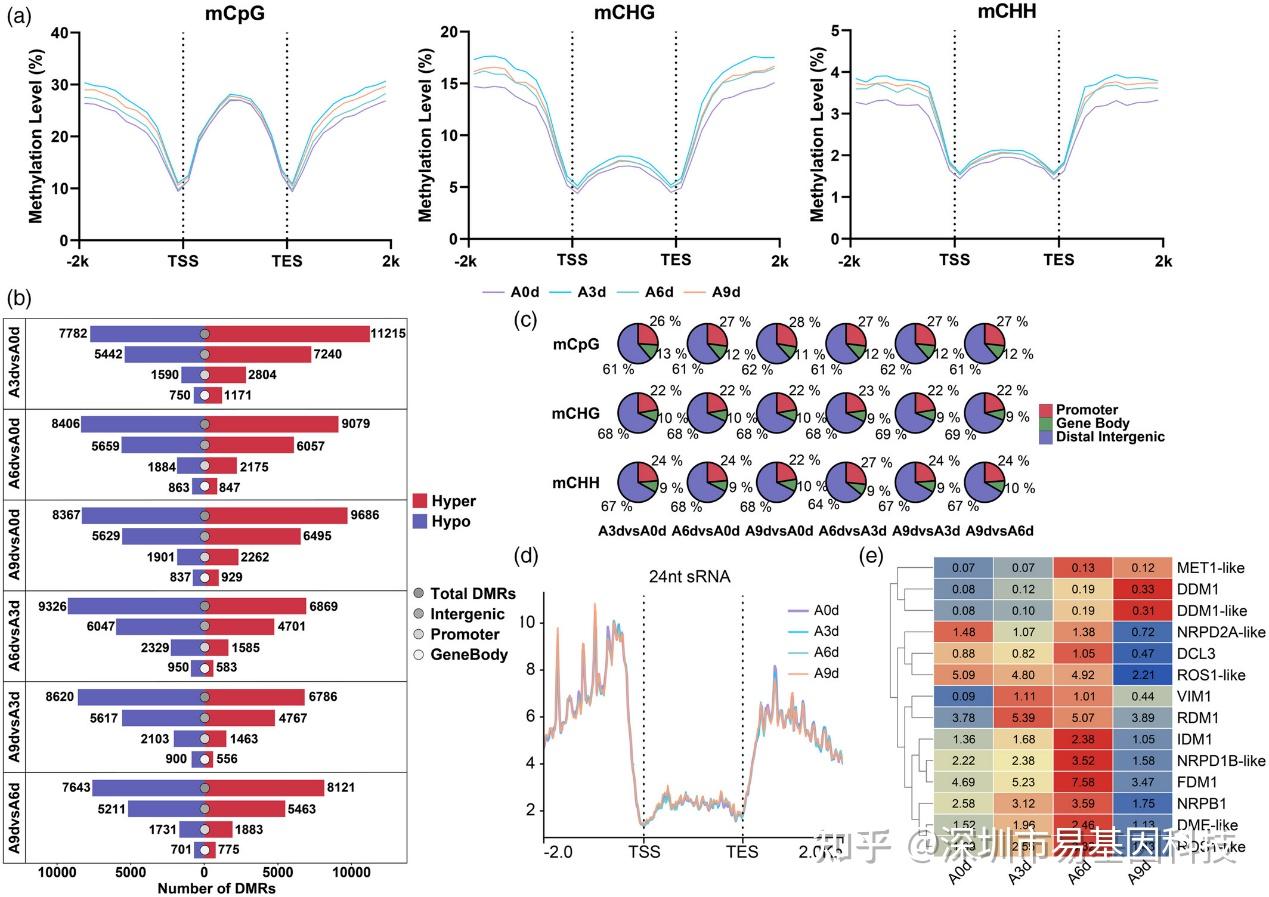 研究通過WGBS技術分析了蘋果在干旱處理下的DNA甲基化變化。結果顯示,在干旱處理早期(A3d),基因區域附近的DNA甲基化水平顯著增加,隨后在A6d略有下降,A9d時又略有回升。表明DNA甲基化在干旱脅迫的早期階段起著關鍵作用。研究還發現與對照組相比,干旱處理下蘋果的mCG、mCHG和mCHH三種DNA甲基化類型均顯著增加。此外研究分析了DNA甲基化與基因表達的相關性,發現差異甲基化區域(DMRs)與DEGs在A3d vs A0d、A6d vs A0d和A9d vs A3d的比較組中呈差異變化模式,這與DNA甲基化在啟動子區域的抑制效應一致。研究還分析了DNA甲基化在全基因組水平的分布,發現mCHH在基因上游2000bp區域內的增加可能與RNA介導的DNA甲基化(RdDM)通路激活有關,但24nt siRNA的富集并未顯著變化。這表明DNA甲基化水平變化可能受多種因子綜合調控。