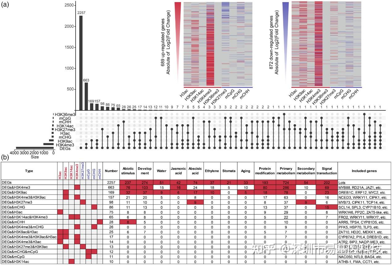 - 由DNA甲基化和組蛋白修飾共同調控的差異表達基因以及這些調控基因表達變化的Upset圖。所有受表觀遺傳修飾調控的上調和下調DEGs與表觀遺傳修飾、log2(變化倍數)和組蛋白修飾之間的關系熱圖。紅色表示與表觀遺傳修飾呈正相關,而藍色表示負相關。