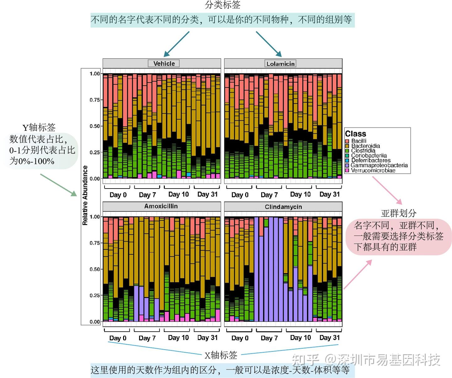 堆疊柱狀圖(Stacked bar chart)多維度展示不同樣本之間的動態變化趨勢,還可以探究哪一部分比例(細菌數量、基因數量等)最大,以及每一部分的變動情況(從有到無及從無到有)。常應用于研究基因組、微生物組、表觀遺傳學等。
