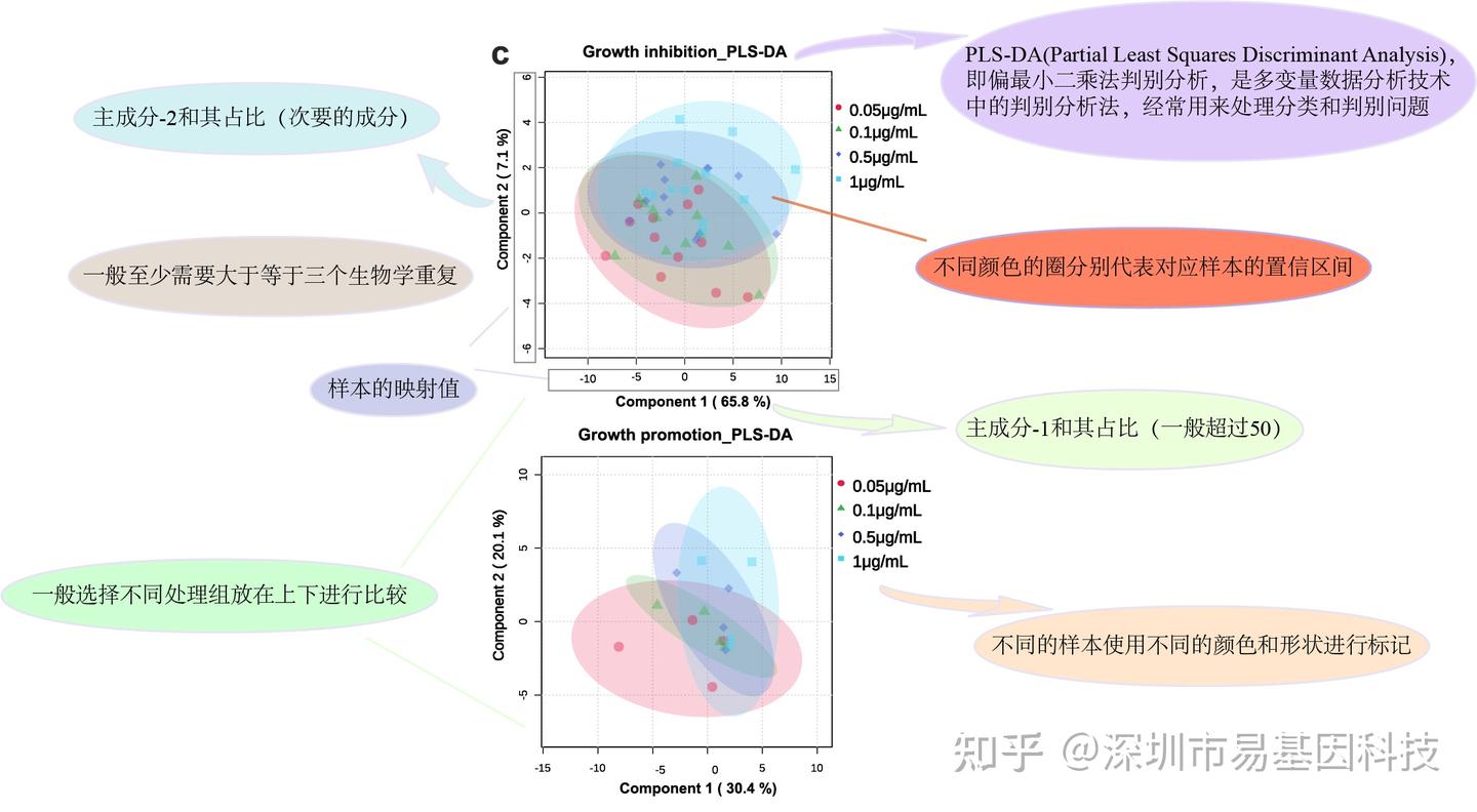 偏最小二乘判別分析(PLS-DA)作為結合偏最小二乘回歸和判別分析的統計方法,它通過尋找最大相關性來提取最有代表的成分,進而用于預測和分類,反映在聚類圖的點與點之間的實際距離,距離越近,樣本越相似。PLS-DA在代謝組學和微生物組學等領域應用廣泛,可以有效處理共線性和高維數據。