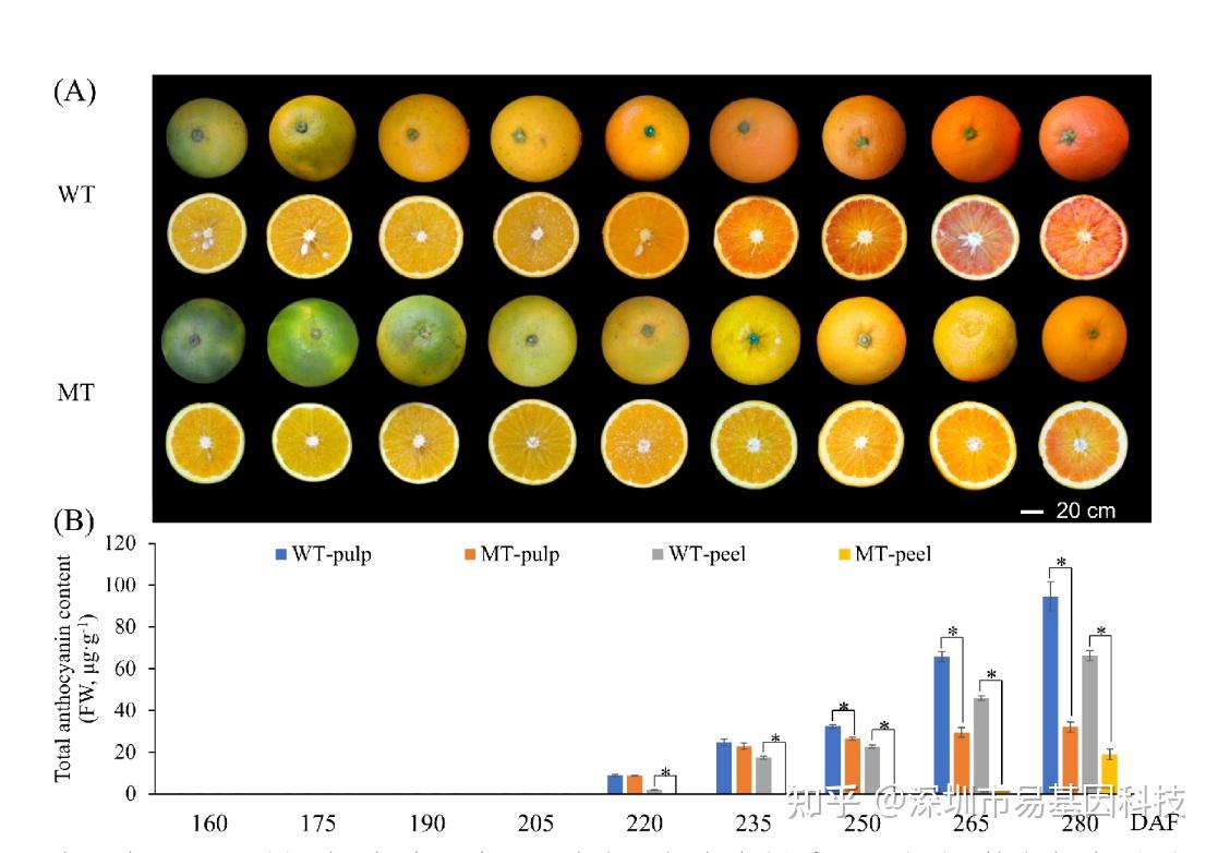 圖1:Tarocco(WT)及其芽變品種(MT)在不同發育階段的外觀(A)及果皮和果肉中總花青素含量(B)。