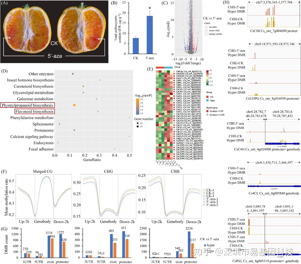 (H) 花青素相關基因(CsCHI、CsUDPG、CsC4H、Cs4CL和CsPAL)啟動子和基因體區域的甲基化水平可視化。Hyper,高甲基化;Hypo,低甲基化。