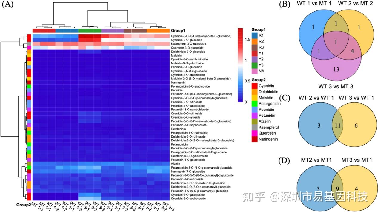 圖2:不同發育階段 Tarocco(WT)及其芽變品種(MT)果肉中花青素組分熱圖(A)和維恩圖(B-D)。