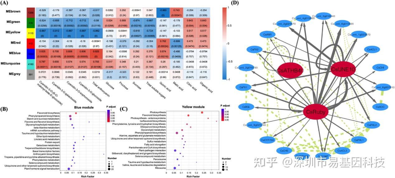 (B-C)KEGG分析顯示,與總花青素性狀相關性最高的正模塊(藍,B)和負模塊(黃,C)中的基因。