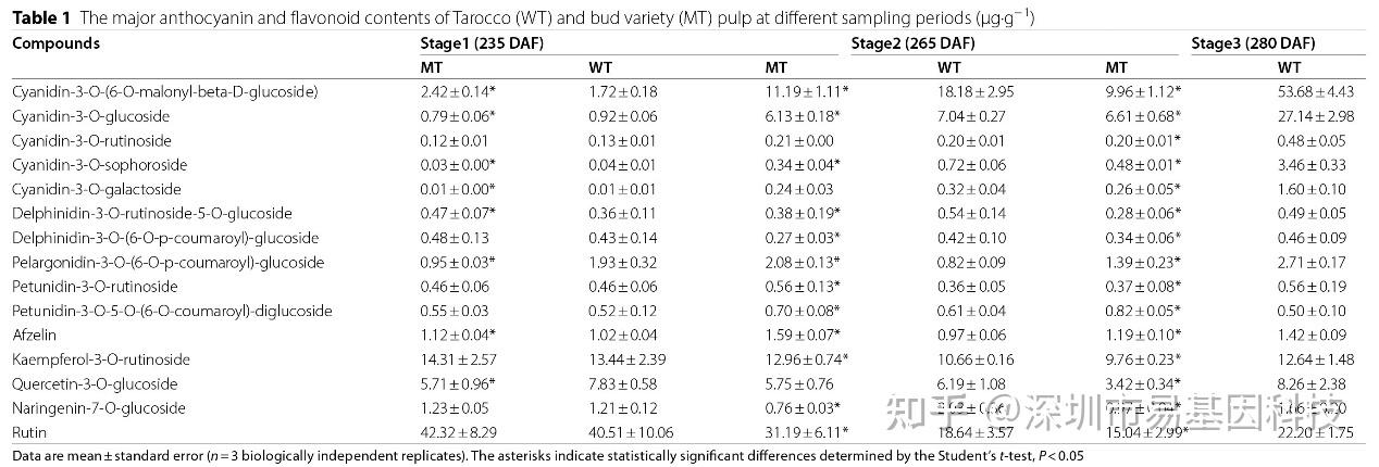 表1:不同采樣時期WT和MT果肉中主要花青素和黃酮類化合物含量(μg·g?1)。