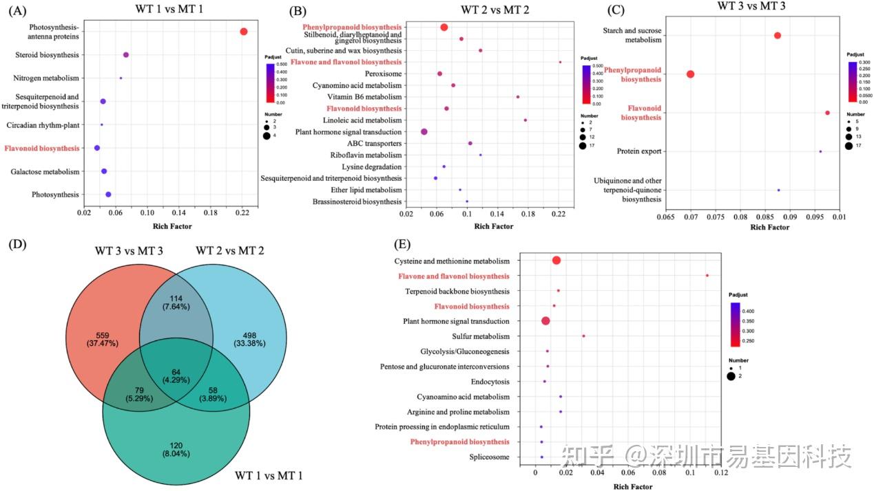 圖3:鑒定并分析Tarocco(WT)和其芽變品種(MT)果肉樣本之間DEGs的功能特征。對以下各組DEGs進行KEGG富集分析:(A)WT 1 與 MT 1,(B)WT 2 與 MT 2,(C)WT 3 與 MT 3;(D)維恩圖展示三個比較組果肉樣本之間共有和特異性基因;(E)對三個比較組中共有的64個DEGs進行KEGG分析。