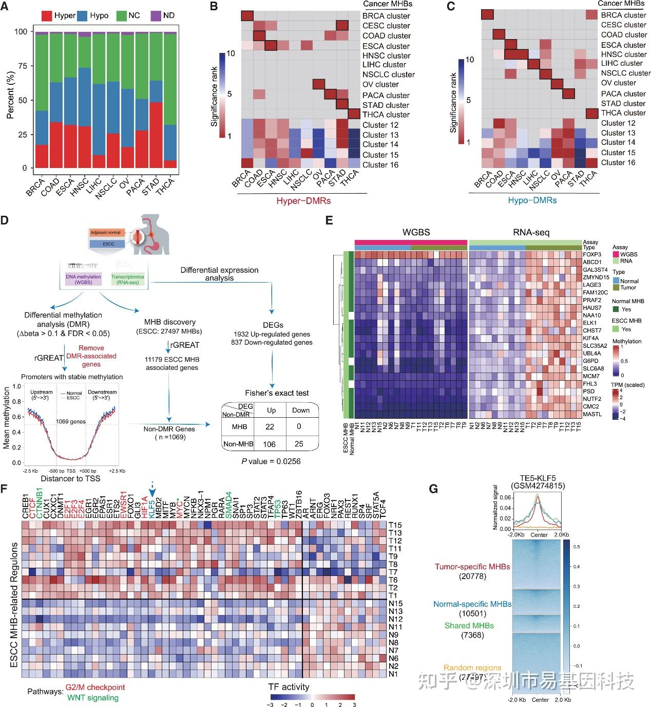 (D) ESCC中MHBs與基因表達失調的關聯分析。ESCC數據集(GSE149612)包含10個腫瘤和匹配的10個正常WGBS和RNA-seq樣本的,ESCC MHBs(n=27,497),ESCC與鄰近正常組織間的DEGs(n=2,769)。