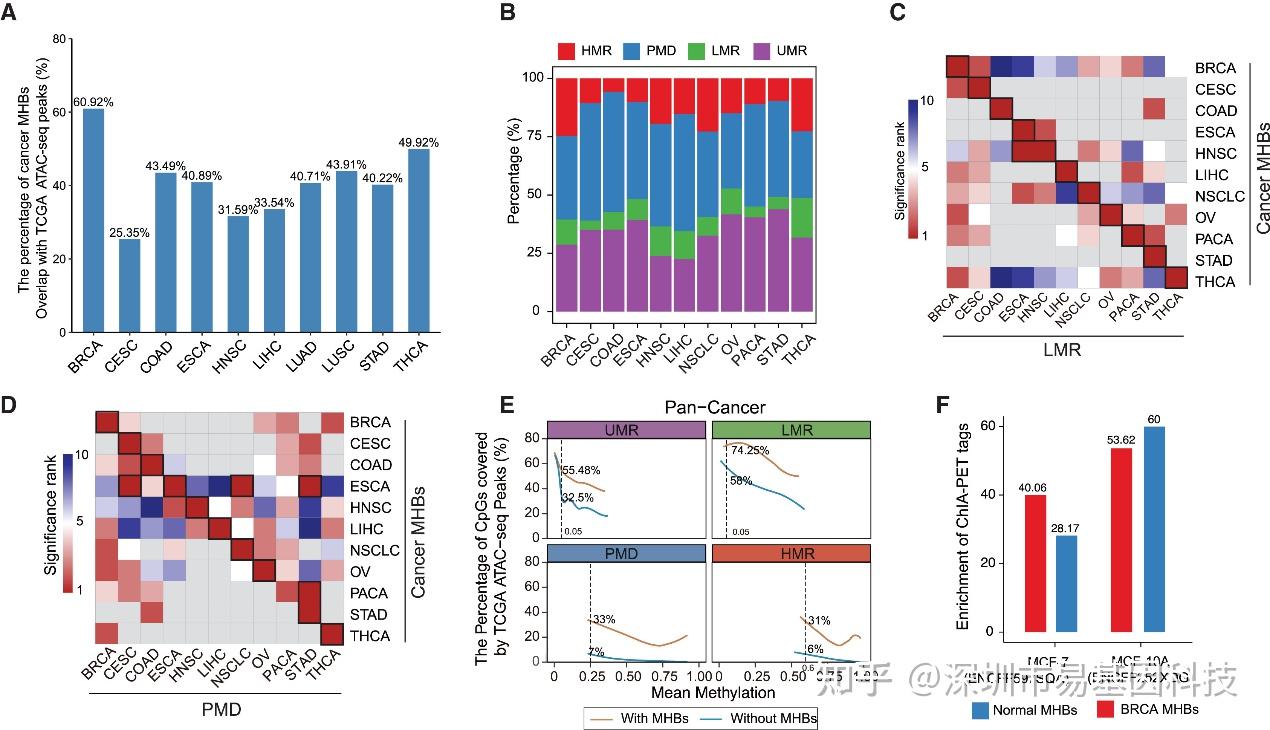 研究團隊發現,癌癥MHBs在開放染色質區域(通過ATAC-seq定義)中顯著富集,超過30%的MHBs與開放染色質區域重疊。通過整合DNA甲基化狀態(UMRs、LMRs、PMDs、HMRs),分析結果揭示MHBs主要位于未甲基化區域(UMRs)和部分甲基化區域(PMDs)(占比約60%),且MHBs在低甲基化區域(LMRs)和部分甲基化區域(PMDs)中表現出癌癥類型特異性的富集,而在UMRs和HMRs中則沒有顯著富集。同時,MHB區域在調控平均甲基化水平后,仍顯示出更高的染色質開放性。