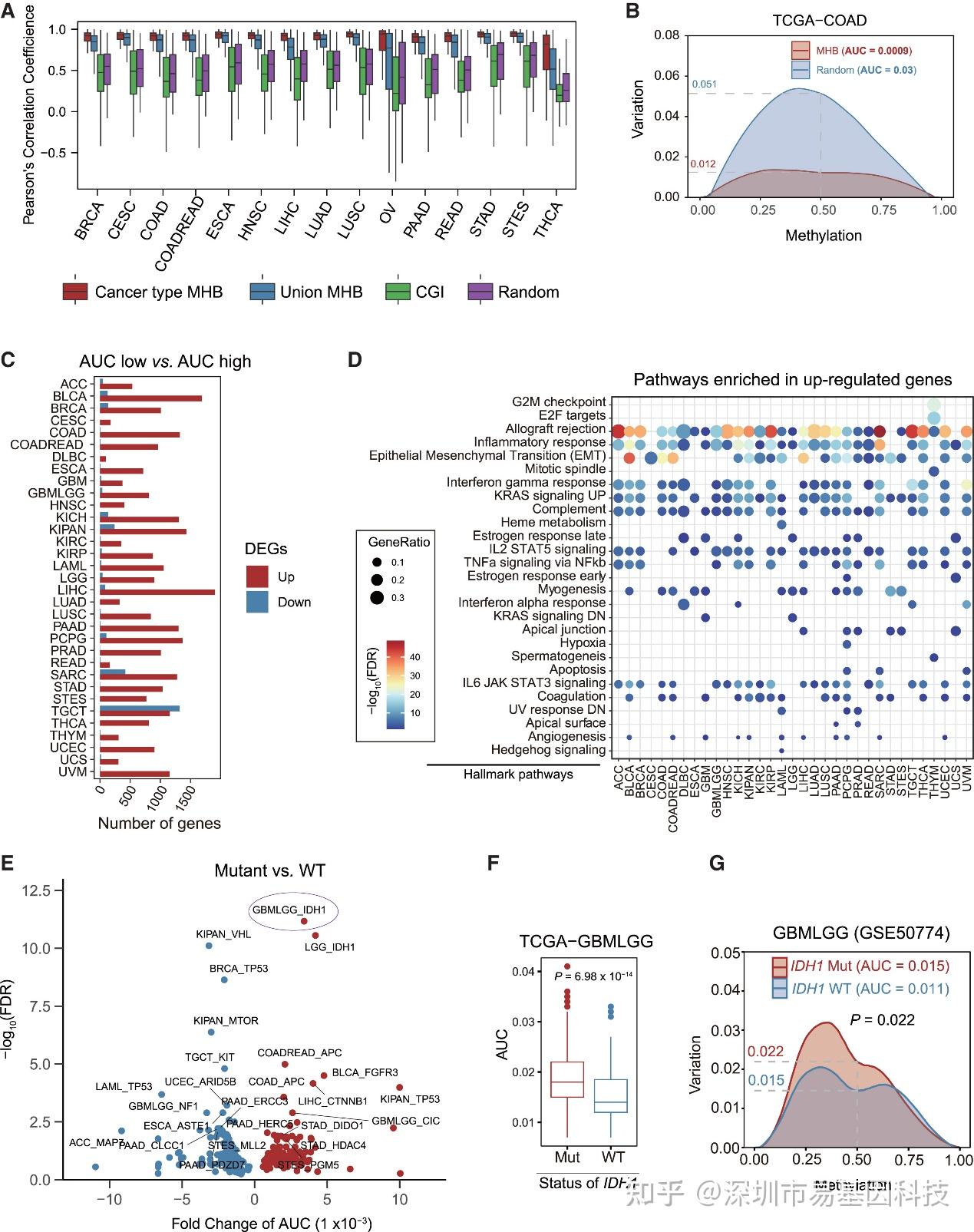 研究團隊分析了MHBs在不同腫瘤中的甲基化一致性,發現腫瘤間存在顯著的甲基化異質性。MHBs內的CpG位點表現出高甲基化相關性,顯著高于隨機基因組區域。通過比較具有極端一致性(AUC)的腫瘤,結果揭示了IDH1突變型膠質瘤的AUC值顯著高于野生型,表明突變驅動了甲基化異質性。