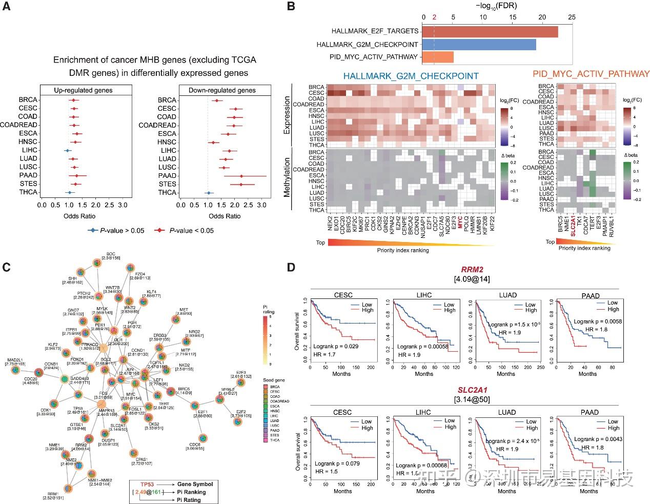 研究人員通過整合TCGA多組學數據發現,MHBs與11種癌癥中DEGs顯著相關,無論有或沒有DMRs基因。通過優先級指數(Priority Index, Pi)分析,研究團隊篩選出8,852個泛癌MHB靶基因,其中53個基因構成通路交叉網絡,包括MYC靶點、G2/M檢查點和E2F通路等關鍵致癌通路。