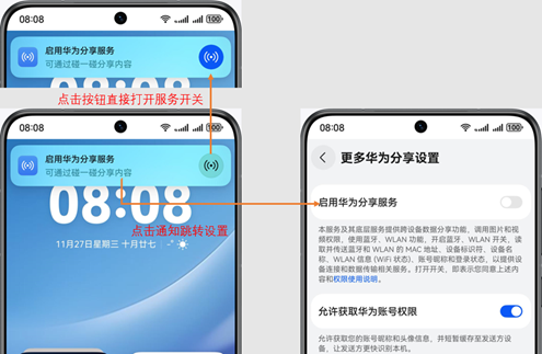 簡單觸碰:當您想要分享某些內容時,只需將兩臺設備在亮屏、解鎖的狀態下并且都已開啟華為分享服務(系統默認開啟),設備頂部輕碰即可觸發。