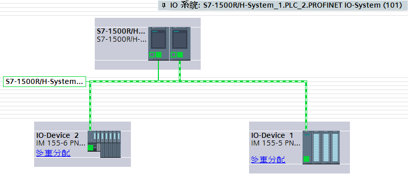 (5).要將 IO 設備分配給冗余系統,應將每個 IO 設備連接到各 CPU。為此,請執行以下步驟: 在 IM 155?5 PN HF 的 PROFINET 接口與左側 CPU 的 PROFINET 接口 X1 之間拖放一條連線。 在 IM 155?5 PN HF 的 PROFINET 接口與右側 CPU 的 PROFINET 接口 X1 之間拖放一條連線。 以同樣的方法將第二個 IO 設備 (IM 155?6 PN HF) 分配給兩個 CPU。為第二個 IO 設備設置看門狗定時器。