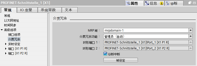 (6).定義冗余系統 CPU 和 IO 設備的 MRP 角色在 STEP 7 中創建了 S7-1500R/H 冗余系統后,STEP 7 將自動為兩個 CPU 的 PROFINET 接口 X1分配 MRP 角色。默認設置取決于拓撲: PROFINET 環網“管理器(自動)” 線型拓撲“非環網中的設備”必要時,需要更改 CPU 的 MRP 角色。為此,請執行以下步驟:1. 在 STEP 7 的網絡視圖中,選擇冗余系統內其中一個 CPU 的 PROFINET 接口 X1。2. 在巡視窗口中,瀏覽到“屬性 > 常規 > 高級選項 > 介質冗余”(Properties > General >Advanced options > Media redundancy)。