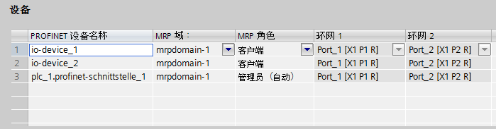 (7).在巡視窗口中,STEP 7 將顯示該 CPU 的 PROFINET 接口 X1 所在 MRP 域的特性。 為 CPU 的 PROFINET 接口 X1 沿用或設置合適的介質冗余角色。 單擊“域設置”(Domain settings) 按鈕。 在“設備”(Devices) 表的“MRP 角色”(MRP role) 列中,按照拓撲為所有 IO 設備分配 MRP 角色:– PROFINET 環網“客戶端”中的所有設備– 線型拓撲“非環網中的設備”中的所有設備下例顯示了為 PROFINET 環網設置 MRP 角色。
