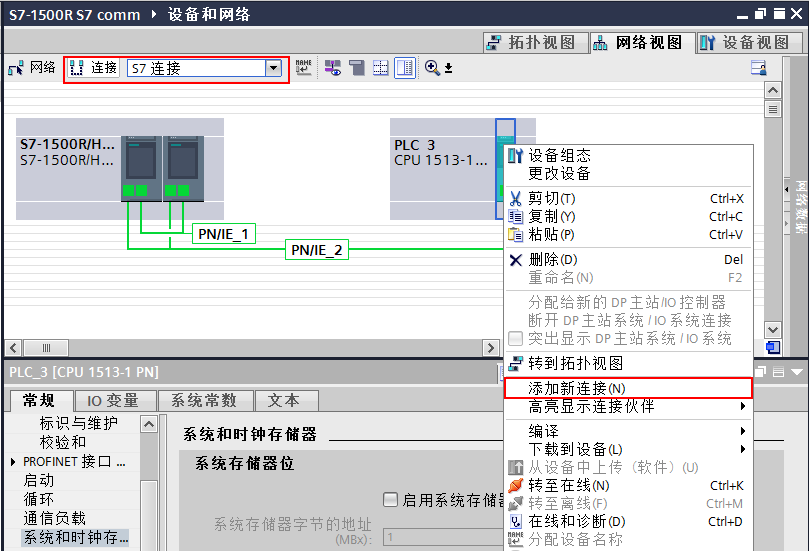 (2)點擊“連接”,右側的下拉框中選擇“S7連接”。鼠標右鍵單擊 CPU1513-1PN,在彈出的對話框中選擇“添加新連接”。隨后點擊“添加”按鈕,添加一個新的S7連接