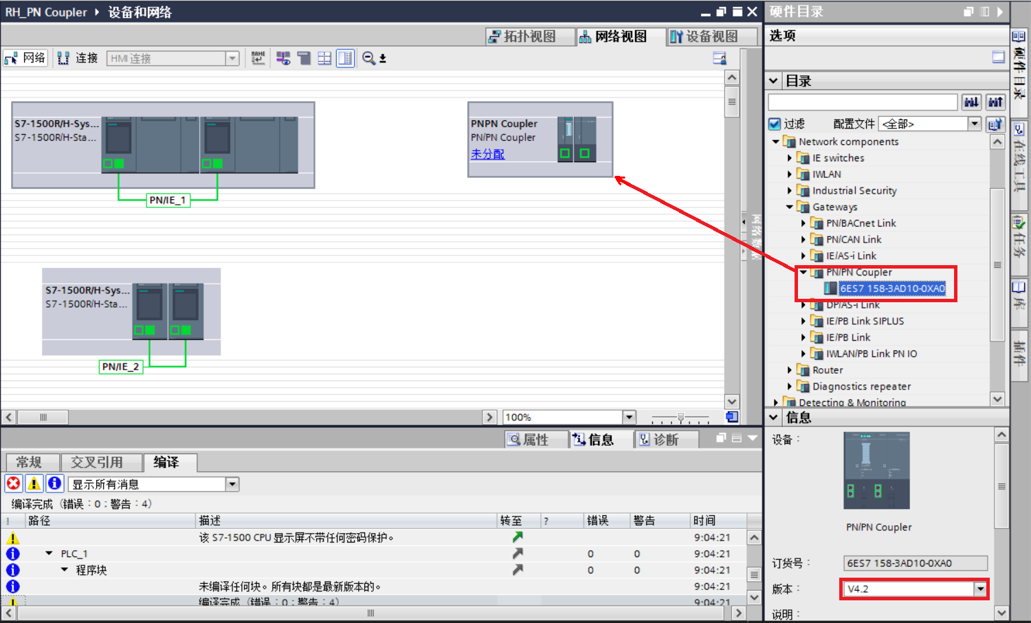 2. 從網絡視圖硬件目錄中的硬件配置中選擇 CPU 1515R-2 PN。