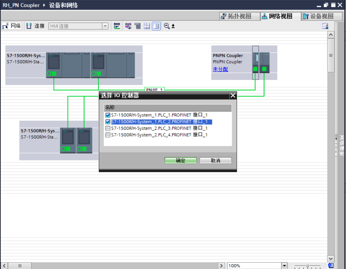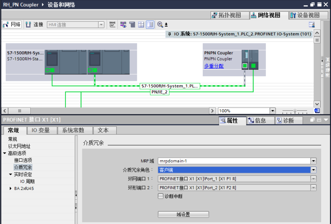 (3).分配控制器,鼠標右鍵點擊PN/PN Coupler左半部分,在彈出菜單中選擇“分配給新的DP主站/IO控制器”,接下來在彈出的IO控制器列表中,選擇兩個CPU1517H之后點擊“確定”按鈕,介質冗余中將角色設置為“客戶端”。