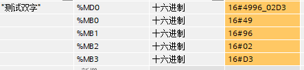 高字節(jié)、低字位對(duì)應(yīng)描述對(duì)象是以字節(jié)為單位,只有比字節(jié)大的存儲(chǔ)單位進(jìn)行數(shù)據(jù)存儲(chǔ)時(shí)才存在這種說(shuō)法,具體到PLC中就是字和雙字,一個(gè)雙字是由四個(gè)連續(xù)的字節(jié)組成,此處以西門子博途MD0的雙字變量作為解析地址舉例來(lái)解析西門子高地址低字節(jié)的意義,定義如下: