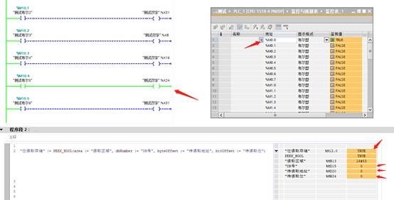 PEEK_BOOL以位的形式對(duì)西門子數(shù)據(jù)進(jìn)行間接尋址,用于在不指定數(shù)據(jù)類型的情況下從標(biāo)準(zhǔn)存儲(chǔ)區(qū)讀取存儲(chǔ)位。指令應(yīng)用舉例為: