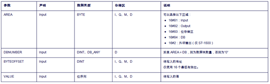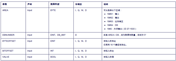 POKE_BOOL以位的形式對(duì)西門子數(shù)據(jù)進(jìn)行間接尋址,用于在不指定數(shù)據(jù)類型的情況下從標(biāo)準(zhǔn)存儲(chǔ)區(qū)寫入存儲(chǔ)位。指令針腳定義如下: