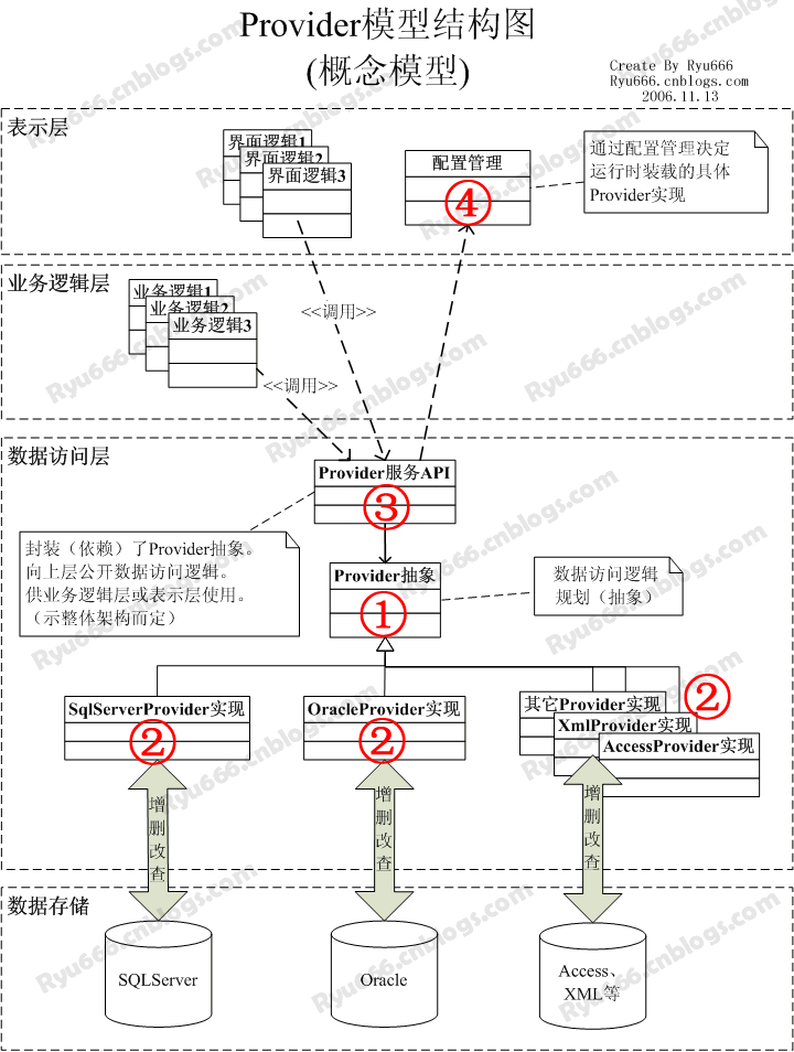 那Provider模型究竟解決了什么設計問題呢?一句話概括:Provider模型解除了客戶代碼對特定存儲的依賴,使應用程序代碼與具體的數據訪問邏輯松耦。而以這種模型設計出來的應用將滿足OCP設計原則(對擴展是開放的,對代碼的修改是封閉的),也就是說利用Provider模型開發系統,將對具體數據儲存有很靈活的擴展性。具體來說,我們的系統開發不再需要考慮最終的數據存儲是使用SQLServer,還是Orcale或者Access,甚至是XML。我們只需要選擇其中一種具體的數據存儲(通常是SQLServer)作為默認的實現;當需求發生改變時(客戶要求數據庫管理系統必須使用Orcale),需要做的動作就只有兩步,其一,根據Orcale數據庫做具體實現類,其二,修改配置;而對于系統已編譯通過的代碼是不需要再修改并編譯,系統仍然是照常工作的。(具體實現將在下一篇中討論)