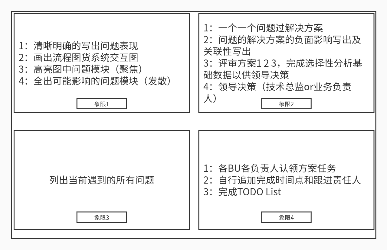 4:最終將大家一起討論出方案分解成一個個活動,由各中心各模塊認領,由他們給出承諾時間點。并最終在第四個象限寫出todolist。