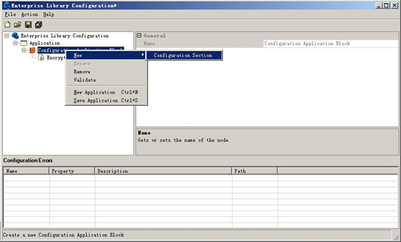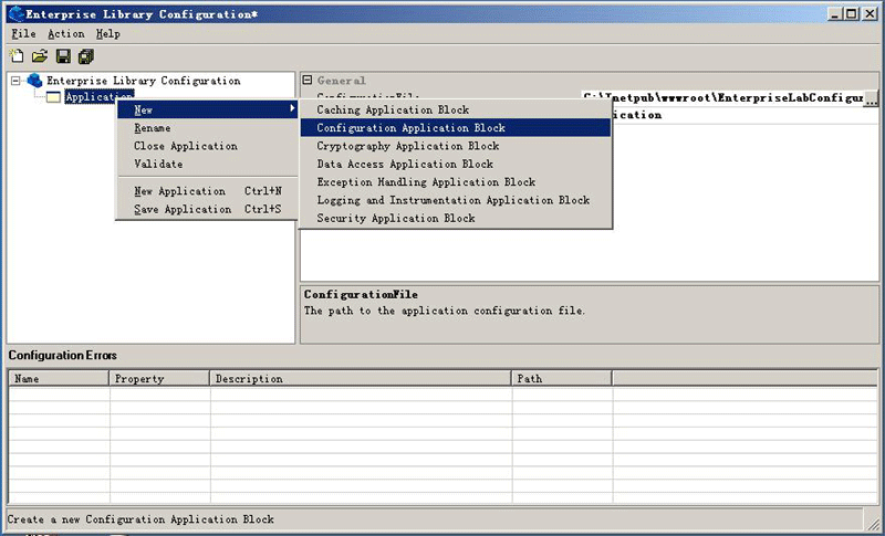 2.右擊Application并選擇New | Configuration Application Block,創(chuàng)建一個(gè)配置應(yīng)用程序塊