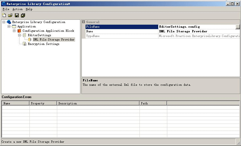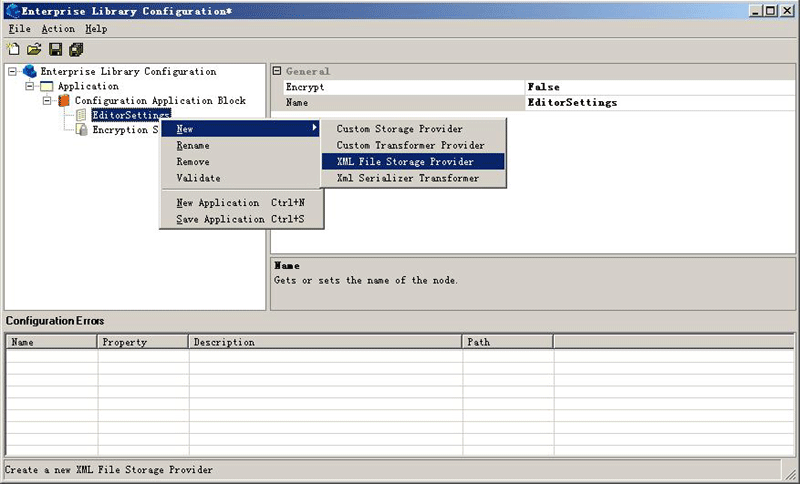3.右擊 Configuration Application Block 并選擇 New | Configuration Section,創(chuàng)建一個(gè)配置區(qū),注意對(duì)于每一個(gè)配置區(qū)都要設(shè)置一個(gè)Storage Provider 和一個(gè)Transformer。