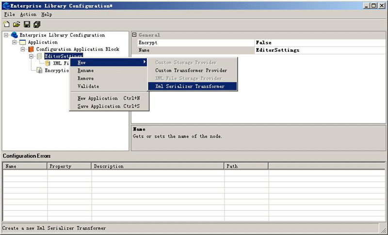 7.在Enterprise Library Configuration 工具里面選擇New | XML Serializer Transformer。指定它的Transformer