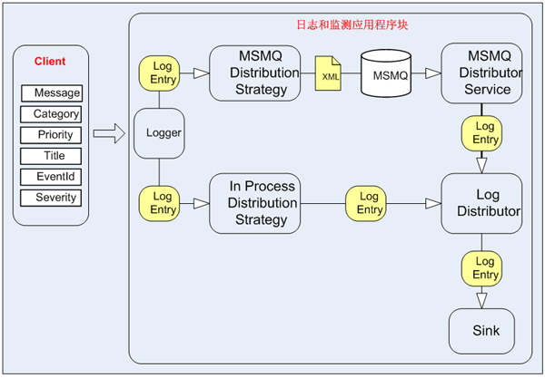 在Enterprise Library Step By Step系列里我們說過,日志和檢測應用程序塊主要由2部分組成:Client和Distributor。Client負責創建消息,這些消息將由Distributor寫入目標位置。Client根據分發策略(Distribution Strategies)發送消息到Distributor,在Application Block中提供了2個分發策略:In Process和MSMQ,默認的是In Process策略。同步日志是在Client進程中完成的,而異步日志是利用了MSMQ來實現的,Client需要創建日志消息并發送到MSMQ消息隊列。另外一個進程則等待到達的消息,并寫入合適的日志接收池