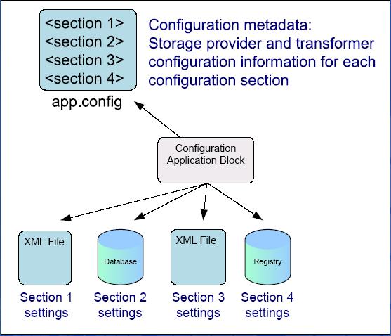 配置應(yīng)用程序塊將配置元數(shù)據(jù)和實(shí)際的配置設(shè)置分隔開(kāi)來(lái)。應(yīng)用程序塊將元數(shù)據(jù)放在它自己的文件中,而該文件獨(dú)立于存儲(chǔ)配置設(shè)置的位置。配置設(shè)置經(jīng)過(guò)分組并稱(chēng)為配置節(jié)。應(yīng)用程序使用的每個(gè)企業(yè)程序庫(kù)應(yīng)用程序塊都有其自己的配置節(jié),該配置節(jié)存儲(chǔ)在其自己的文件中。配置應(yīng)用程序塊使用配置元數(shù)據(jù)來(lái)訪問(wèn)配置中的數(shù)據(jù)。