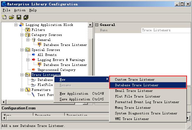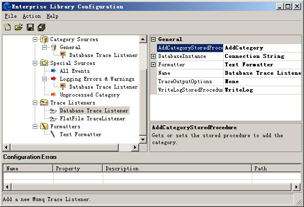 新建一個Web站點后,添加Web.config文件,并用EntLibConfig.exe打開,新建Logging Application Block后,再新建Database Trace Listener: