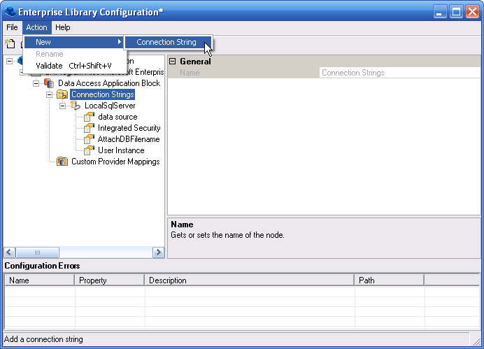 6.如果在machine.config中已經(jīng)定義了connectionStrings配置區(qū),你會(huì)發(fā)現(xiàn)Enterprise Library Configuration工具會(huì)自動(dòng)創(chuàng)建一個(gè)數(shù)據(jù)訪問(wèn)應(yīng)用程序塊。選中Data Access Application Block | Connection Strings節(jié)點(diǎn),并選擇菜單Action | New | Connection String命令。