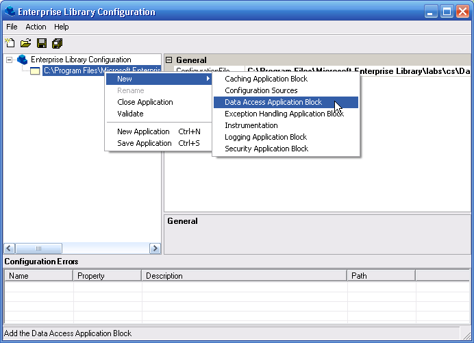 7.如果沒有數(shù)據(jù)訪問(wèn)應(yīng)用程序塊定義,在Application上右擊并選擇New | Data Access Application Block,即可創(chuàng)建一個(gè)新的數(shù)據(jù)訪問(wèn)應(yīng)用程序塊。