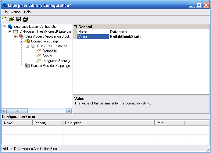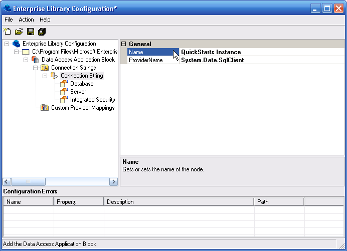 8.選擇Data Access Application Block | Connection Strings | Connection String節(jié)點(diǎn),修改Name屬性為QuickStarts Instance。