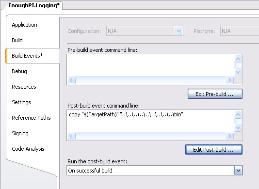 4.拷貝輸出程序集到Enterprise Library的安裝bin目錄下面。選擇項目EnoughPI.Logging,選擇Project | EnoughPI.Logging Properties…菜單命令,并選擇Build Events項,添加如下命令到編譯完成后事件中:
