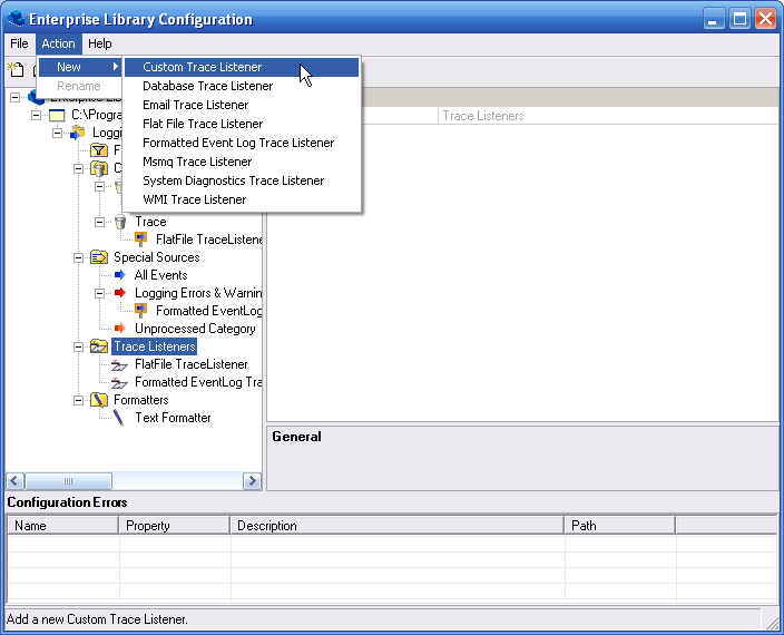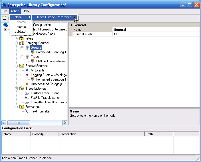 8.選中Logging Application Block | Category Sources | General節點,選擇Action | New | Trace Listener Reference菜單命令。