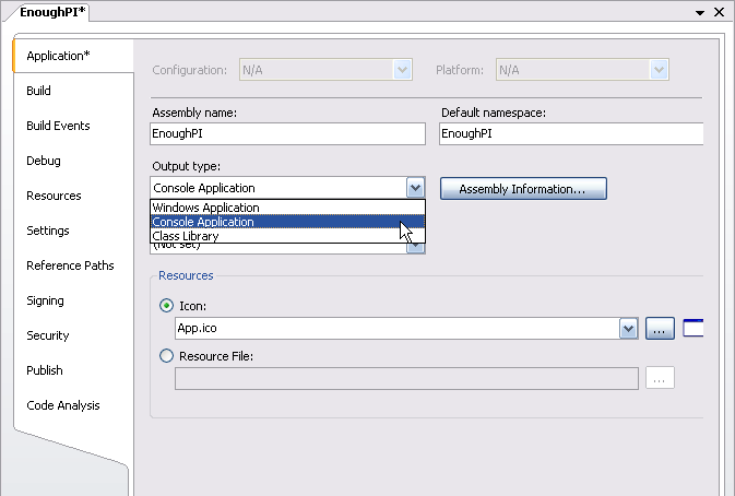 1.選擇項目EnoughPI,并選擇Project | EnoughPI Properties…菜單命令,在項目屬性對話框中選擇Application設置Output type為Console Application。