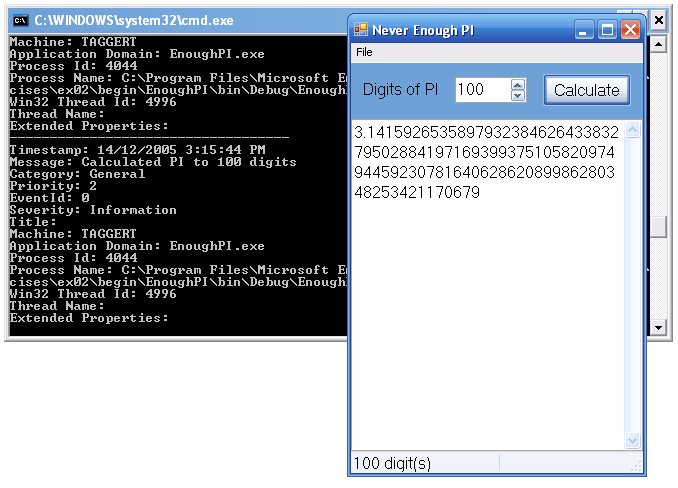 3.選擇Debug | Start Without Debugging菜單命令并運行應用程序,EnoughPI程序用來計算∏的精度。在NumericUpDown控件中輸入你希望的精度并點擊Calculate按鈕。可以看到日志項顯示在一個控制臺窗口中。